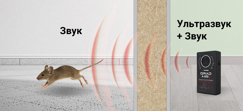 В режиме 2х мощности отпугиватель "ГРАД А-650Д" действует даже на вредителей внутри стен!
